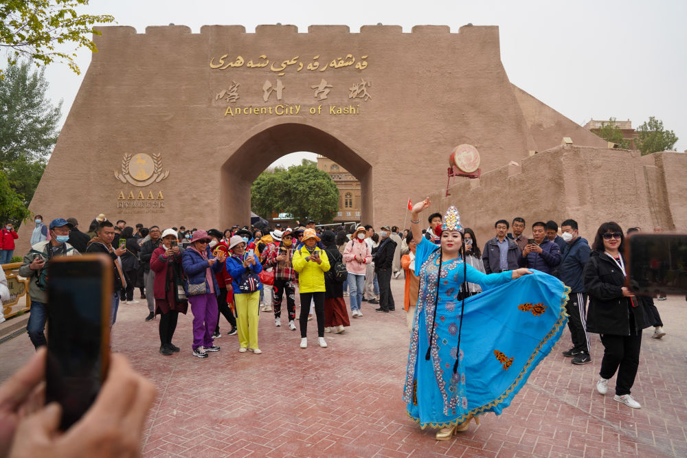 在新疆喀什古城景區(qū),游客打卡拍照(2023年4月21日攝)。新華社記者 丁磊 攝