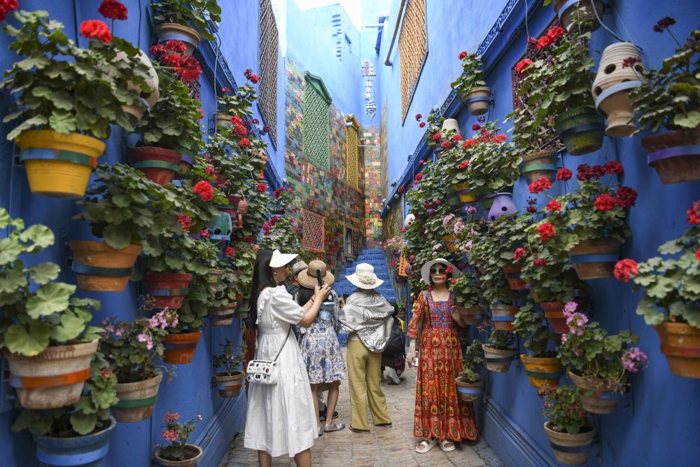 人們?cè)谛陆κ补懦蔷皡^(qū)彩虹巷內(nèi)游玩拍照(2023年6月14日攝)。新華社記者 胡虎虎 攝