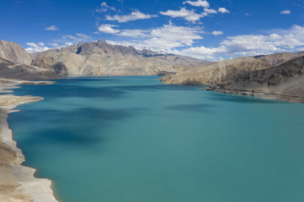 位于新疆塔什庫爾干塔吉克自治縣的“班迪爾藍(lán)湖”一角(2023年8月28日攝,無人機(jī)照片)。新華社記者 胡虎虎 攝
