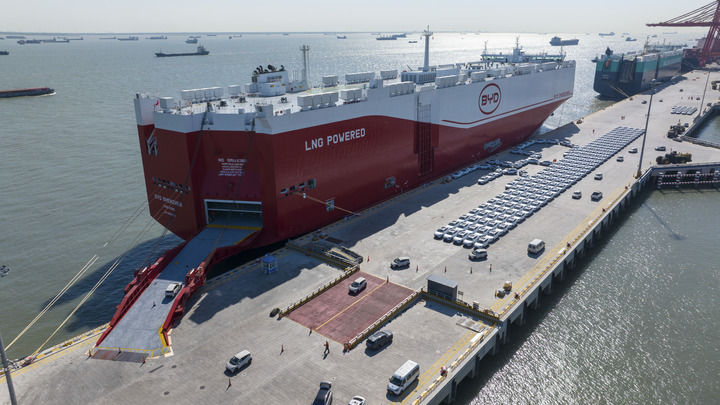 2025年4月26日,出口汽車在蘇州港太倉港區(qū)碼頭集中裝載上“深圳號(hào)”汽車運(yùn)輸船(無人機(jī)照片)。新華社發(fā)(王須中 攝)