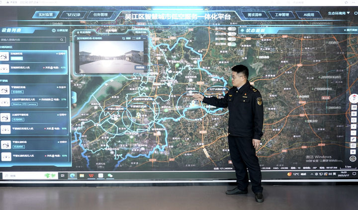 2025年3月17日,在江蘇吳江太浦河驛站,當(dāng)?shù)厣鷳B(tài)環(huán)境部門工作人員介紹無人機(jī)巡航情況。新華社記者 季春鵬 攝