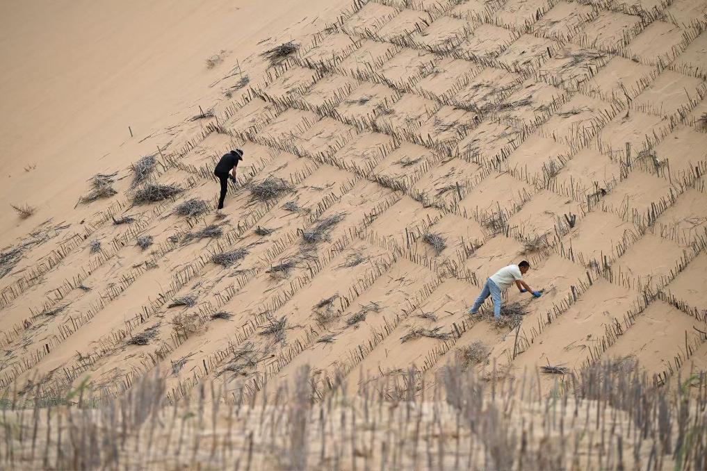鄂爾多斯市達拉特旗農民在防沙治沙項目區(qū)鋪設沙障。新華社發(fā)(楊耀中 攝)