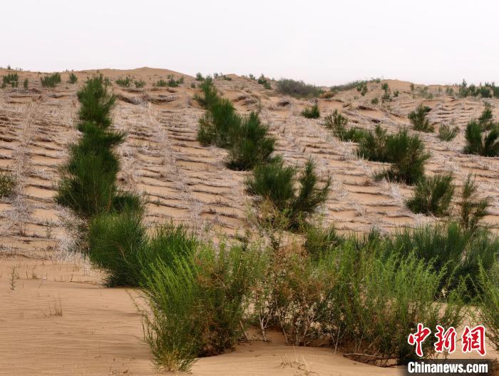 夏日驕陽炙烤著九棵樹治沙項目區(qū),廣袤的沙地上,一排排整齊的草方格如同給沙丘上了“鎖鏈”,而這些被固定住的流沙,為植被生長創(chuàng)造了重要條件。