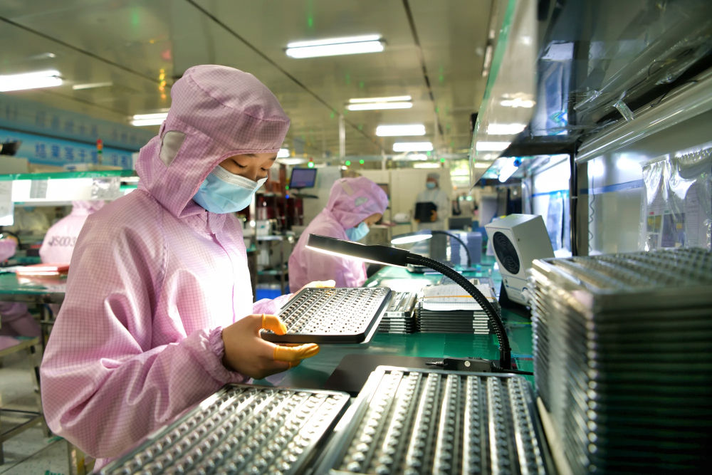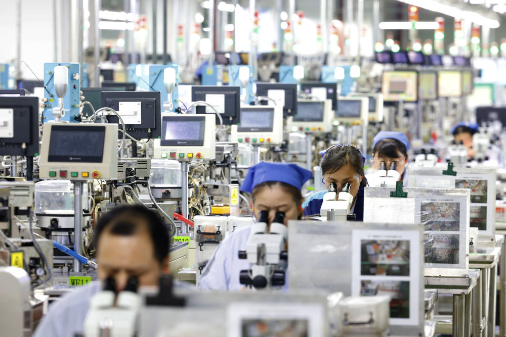 6月24日,在江蘇宿遷泗洪經(jīng)濟(jì)開發(fā)區(qū)慶邦電子元器件(泗洪)有限公司車間內(nèi),工人加緊趕制出口的電子訂單產(chǎn)品。新華社發(fā)(許昌亮攝)