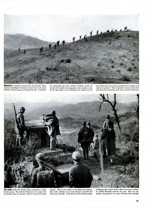 這是1939年7月出版的美國(guó)《生活》雜志第13頁影印件,展示了史沫特萊拍攝的新四軍訓(xùn)練和偵察的一些畫面。上圖:新四軍的新兵們開展戰(zhàn)術(shù)訓(xùn)練;下圖:新四軍的偵察小隊(duì)正在山谷中執(zhí)行敵情偵察任務(wù)。