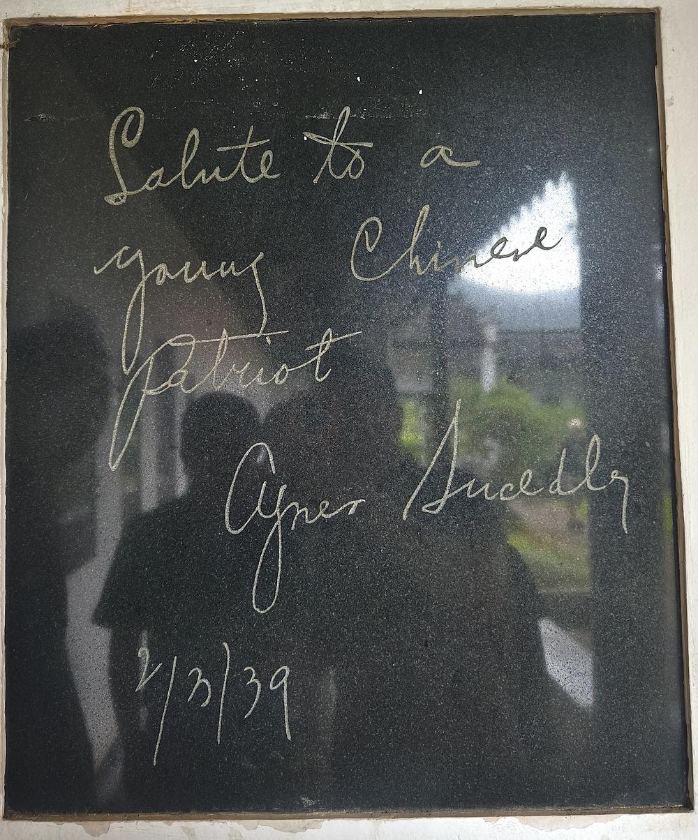 1939年史沫特萊寫給新四軍教導(dǎo)總隊(duì)學(xué)員葛涼的一句話語,如今也被鐫刻在石碑之上——“Salute to a young Chinese patriot(向一位年輕的中國(guó)愛國(guó)者致敬)”。