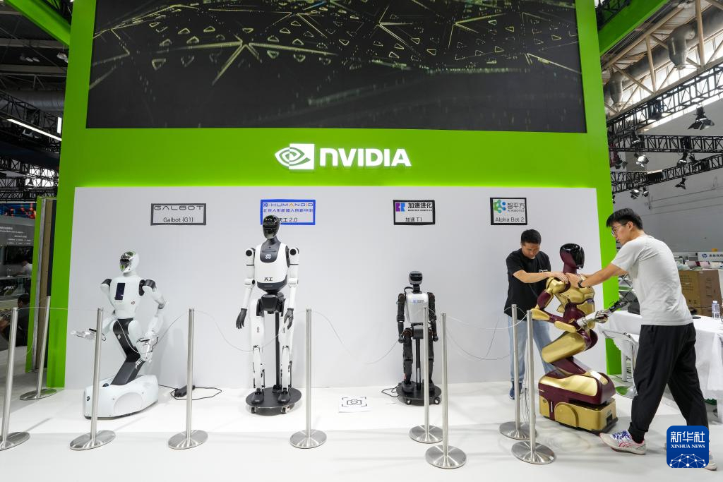 7月14日,在第三屆中國國際供應(yīng)鏈促進博覽會數(shù)字科技鏈展區(qū)英偉達公司展位,工作人員在布置展品。