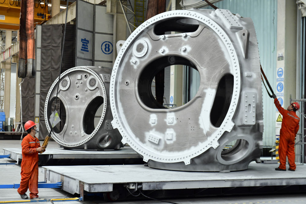 在位于山東省濱州市惠民縣的山東國創(chuàng)精密機(jī)械有限公司,工作人員在對(duì)風(fēng)電輪轂進(jìn)行噴涂作業(yè)。新華社記者郭緒雷 攝