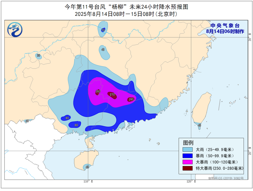 預(yù)計,8月14日08時至15日08時,廣東大部、廣西大部、福建東南部、江西南部、湖南中南部和西北部、貴州東部等地有大到暴雨,部分地區(qū)大暴雨,其中,廣東北部、廣西東北部、湖南南部、江西西南部等地局地有特大暴雨(250~280毫米)。上述部分地區(qū)伴有短時強降水(最大小時降雨量20~50毫米,局地可超過70毫米),局地有雷暴大風(fēng)等強對流天氣。