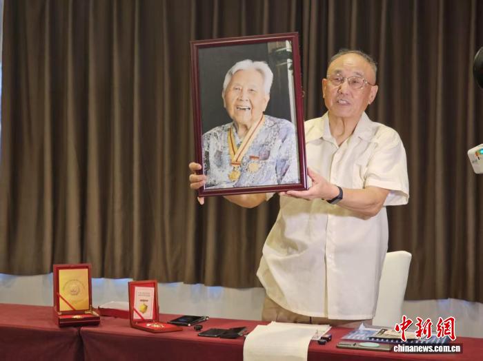 臺(tái)胞蘇菁之子張正光舉起2015年母親佩戴中國(guó)人民抗日戰(zhàn)爭(zhēng)勝利60周年、70周年紀(jì)念章拍下的照片。黃欣欣 攝