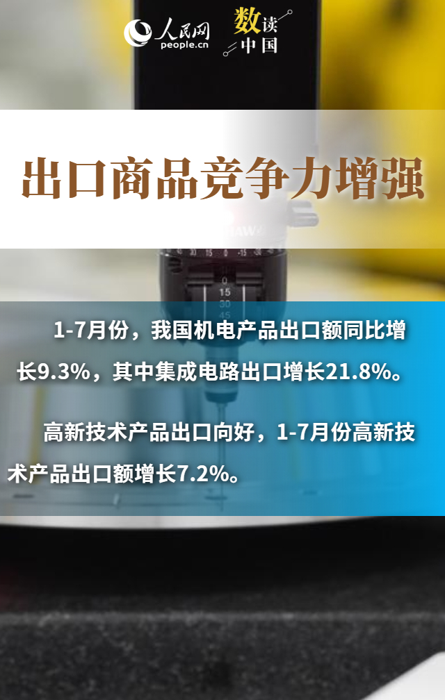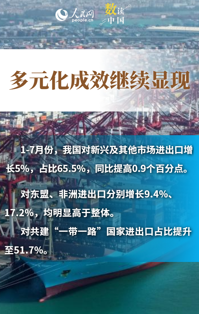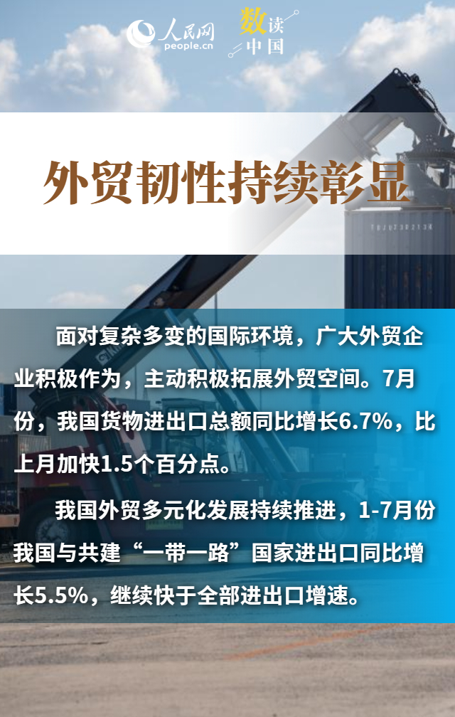進出口規(guī)模創(chuàng)歷史新高、“朋友圈”不斷擴大、民營企業(yè)持續(xù)創(chuàng)新……數據顯示,今年前7個月,我國貨物貿易進出口總值25.7萬億元,同比增長3.5%。在外部挑戰(zhàn)之下,我國貨物進出口持續(xù)增長,展現出較強韌性和活力,為世界經濟復蘇注入了中國力量。