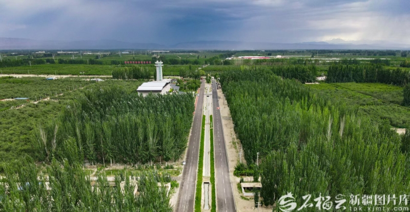 2023年拍攝到的柯柯牙荒漠綠化工程,道路左側(cè)建筑為柯柯牙紀(jì)念館。楊碩攝
