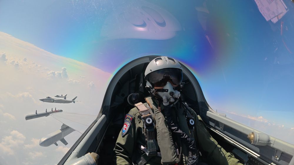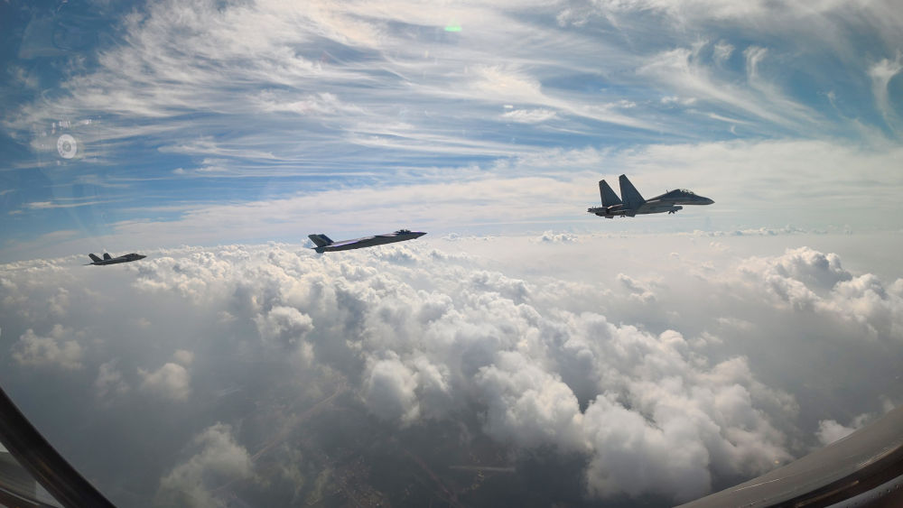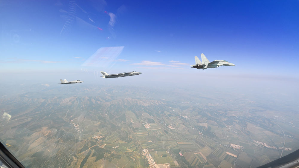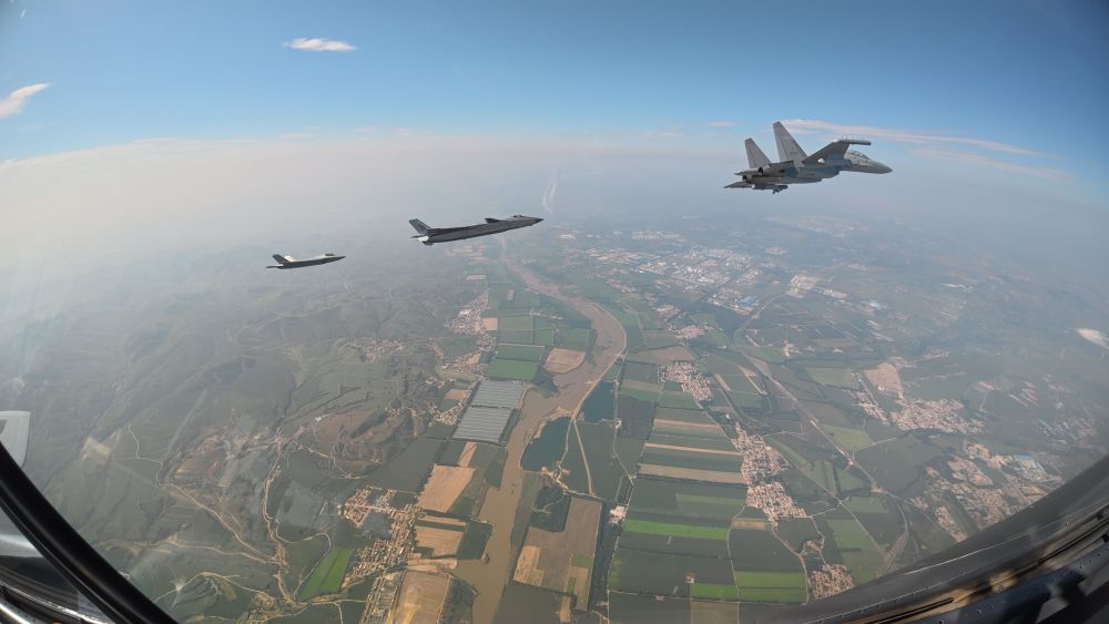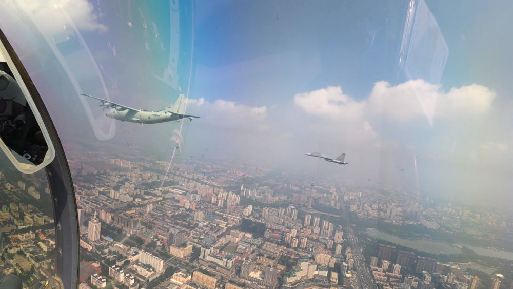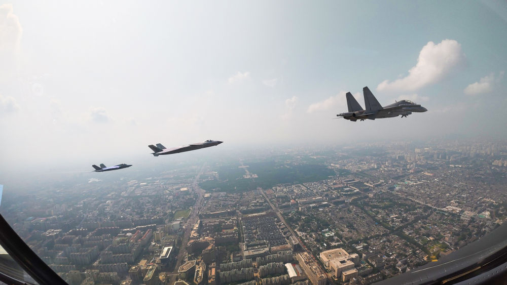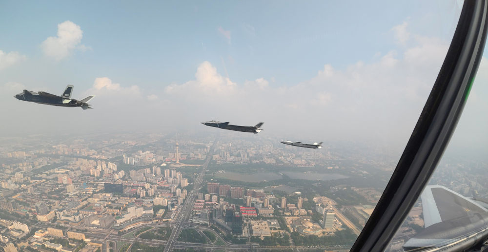 ↑這是殲擊機梯隊從北京城區(qū)上空飛過。