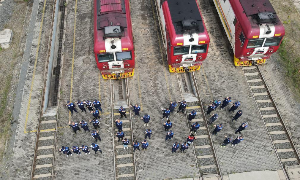 2025年8月19日,在肯尼亞內(nèi)羅畢非洲之星鐵路運營有限責(zé)任公司機務(wù)運轉(zhuǎn)整備場,中肯兩國鐵路工作者在機車前站列并組成“3000”字樣,以紀念蒙內(nèi)鐵路實現(xiàn)安全運營3000天(無人機照片)。新華社記者 楊光 攝