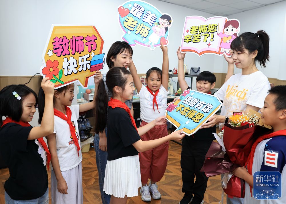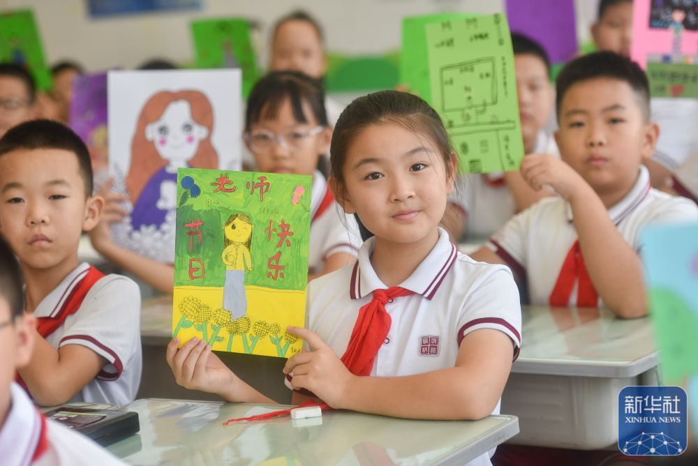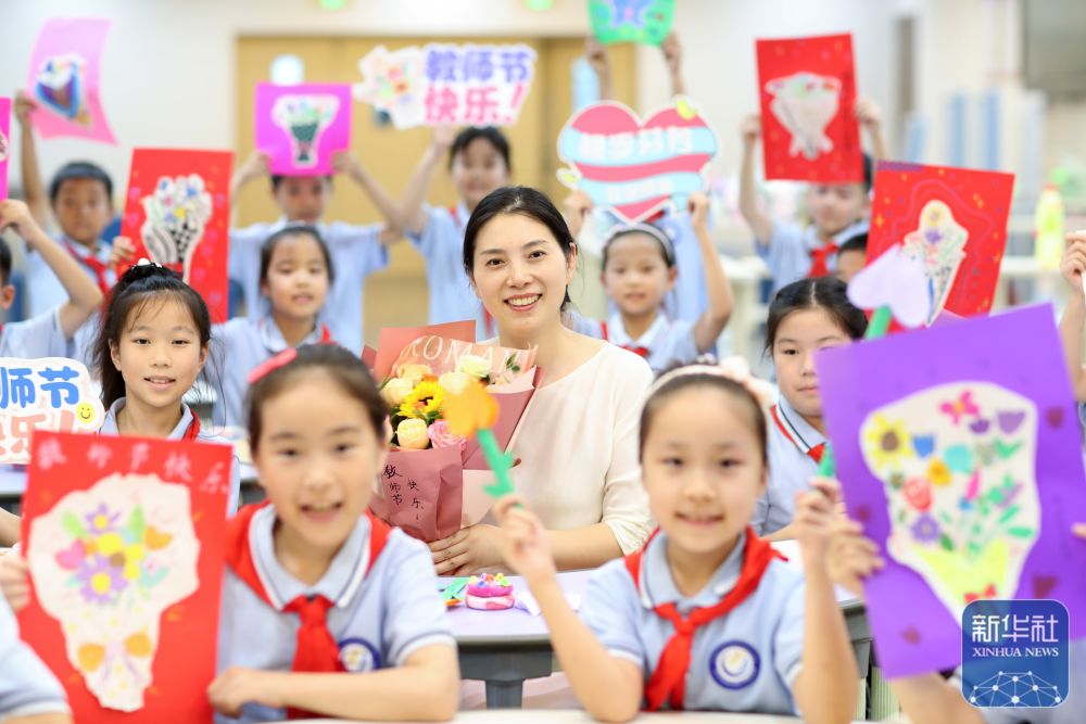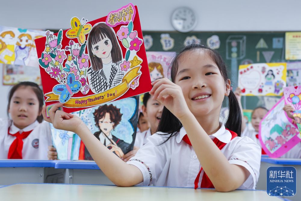 9月9日,在武漢市未來實(shí)驗(yàn)小學(xué)美林校區(qū),學(xué)生為教師送上節(jié)日祝福。新華社發(fā)(趙軍攝)