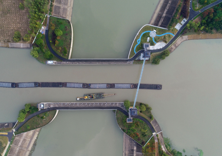 作為淮河入海水道二期工程的核心節(jié)點(diǎn),淮安水利樞紐大運(yùn)河水上立交建成便是“亞洲最大水立交”。京杭大運(yùn)河、蘇北灌溉總渠、淮河入海水道,三條載入史冊的人工水道在此交匯,“兩橫一縱”的格局間,藏著建設(shè)者們最棘手的難題?!岸诠こ桃o鄰布置,水系又密、水頭還高?!蓖鹾橛裉直葎澲鴺屑~布局,“我們先做好基坑防滲工作,再通過開挖臨時導(dǎo)航明渠來保障運(yùn)河航運(yùn),工程在緊鑼密鼓地推進(jìn)。”