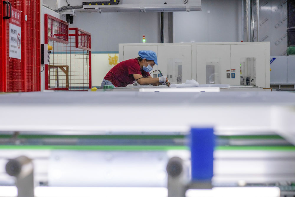 9月22日,工人在新疆巴音郭楞蒙古自治州若羌縣的國(guó)晟企誠(chéng)新能源有限公司對(duì)光伏電池片進(jìn)行疊層返修。