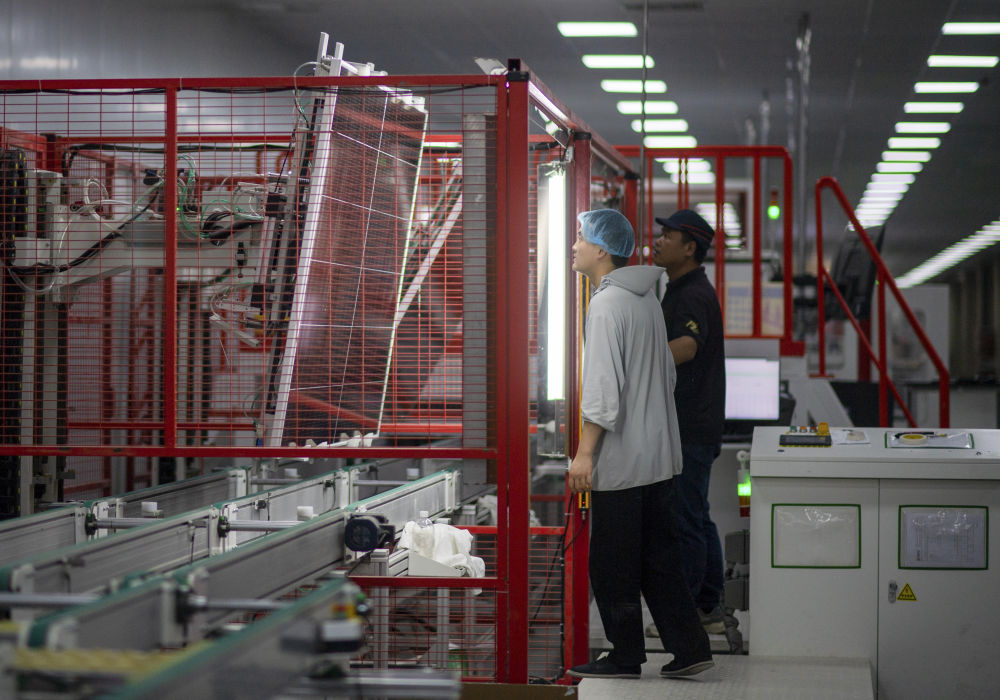 9月22日,工人在新疆巴音郭楞蒙古自治州若羌縣的國(guó)晟企誠(chéng)新能源有限公司生產(chǎn)光伏電池片。