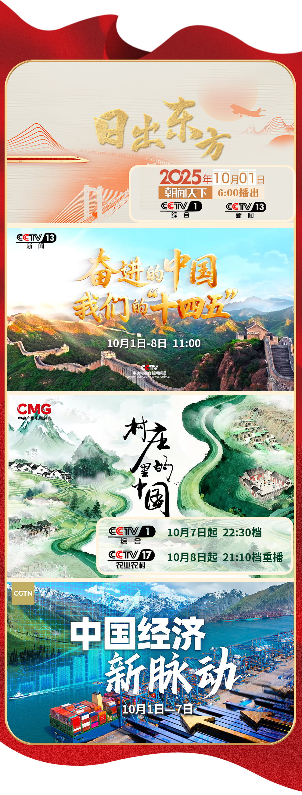 金秋潑彩山河醉,家國同輝氣象新。10月1日晚八點,《中國夢 家國情——2025國慶特別節(jié)目》將在《我愛你中國》的大合唱中拉開大幕。特別節(jié)目走進城市地標與文化遺址,展現山河新貌與奮斗者群像。經典曲目、交響合唱、新創(chuàng)歌曲傳遞濃濃家國情懷??箲?zhàn)老兵、奧運冠軍、各行各業(yè)奮斗者深情講述……整場節(jié)目,洋溢著中華民族偉大復興勢不可擋的壯志豪情。