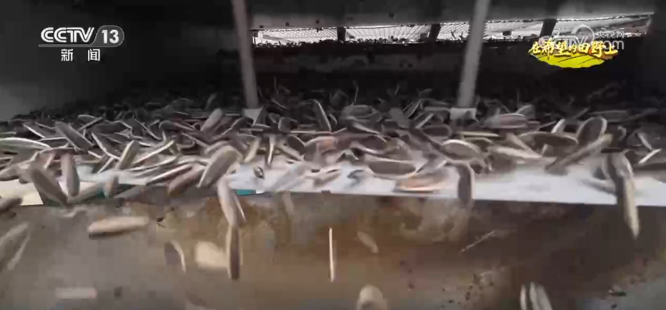 這種節(jié)奏感十足的采收方式與向日葵獨特的生長方式有關(guān),成熟的向日葵花盤低垂,采收時需要“第一砍”先將花盤砍下,“第二砍”再將株稈砍短,“第三插”把向日葵花盤向上插進(jìn)株稈。經(jīng)過幾天的充分晾曬后,花盤水分減少,籽粒更加緊實,這時再收進(jìn)脫粒機(jī)完成脫粒作業(yè),經(jīng)過清選、去雜后發(fā)往加工廠。