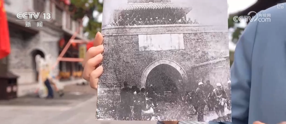 莒國古城里到處都是喜氣洋洋、熱鬧非凡。這張?zhí)厥獾恼掌【暗鼐褪窃谶@里,這是當(dāng)年莒城解放戰(zhàn)后的情形,戰(zhàn)士們登上了城樓,定格下了這份來之不易的勝利。