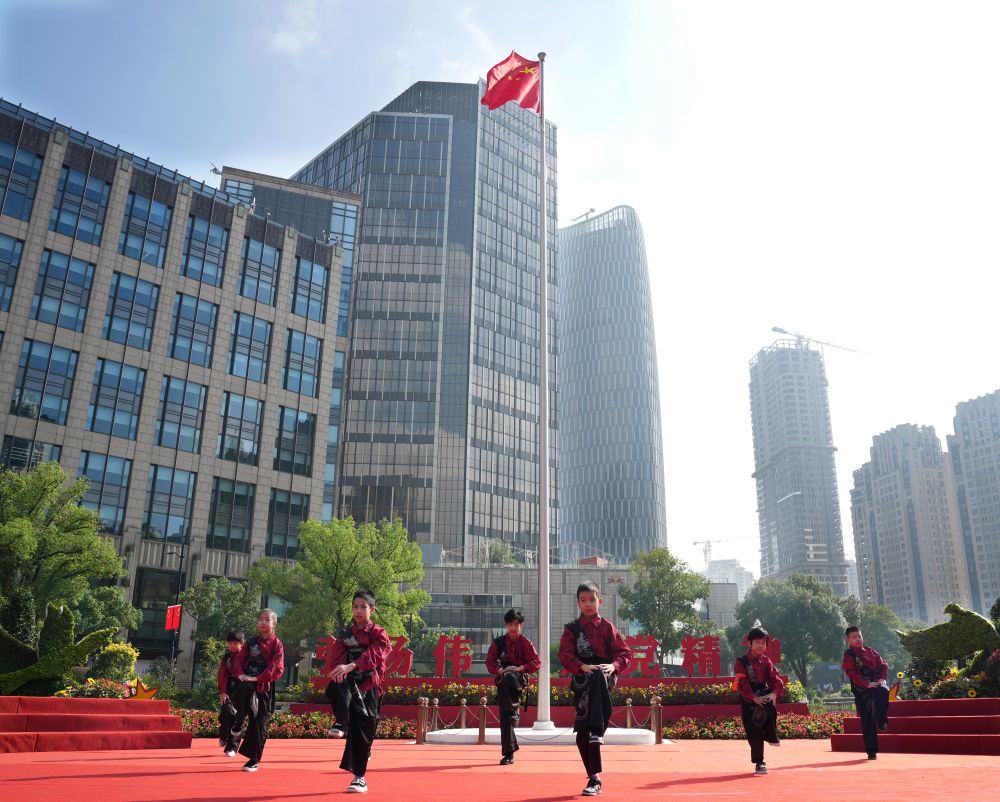 10月1日,在上海中共一大紀(jì)念館前舉行的文藝演出中,小朋友在表演舞蹈《男兒當(dāng)自強》。新華社記者 劉穎 攝