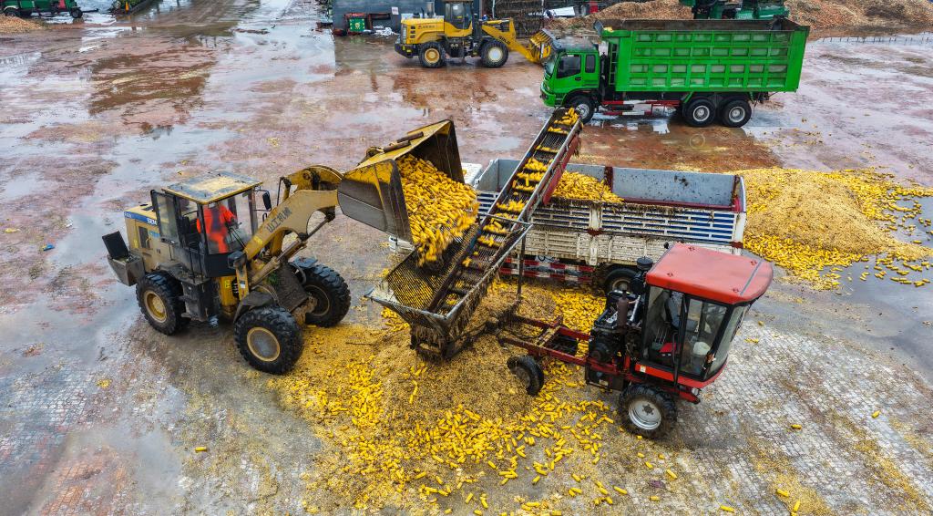 在山東省東營市廣饒縣一家糧食收儲企業(yè),工作人員在裝運(yùn)玉米進(jìn)行脫粒(無人機(jī)照片)。(劉云杰 攝)