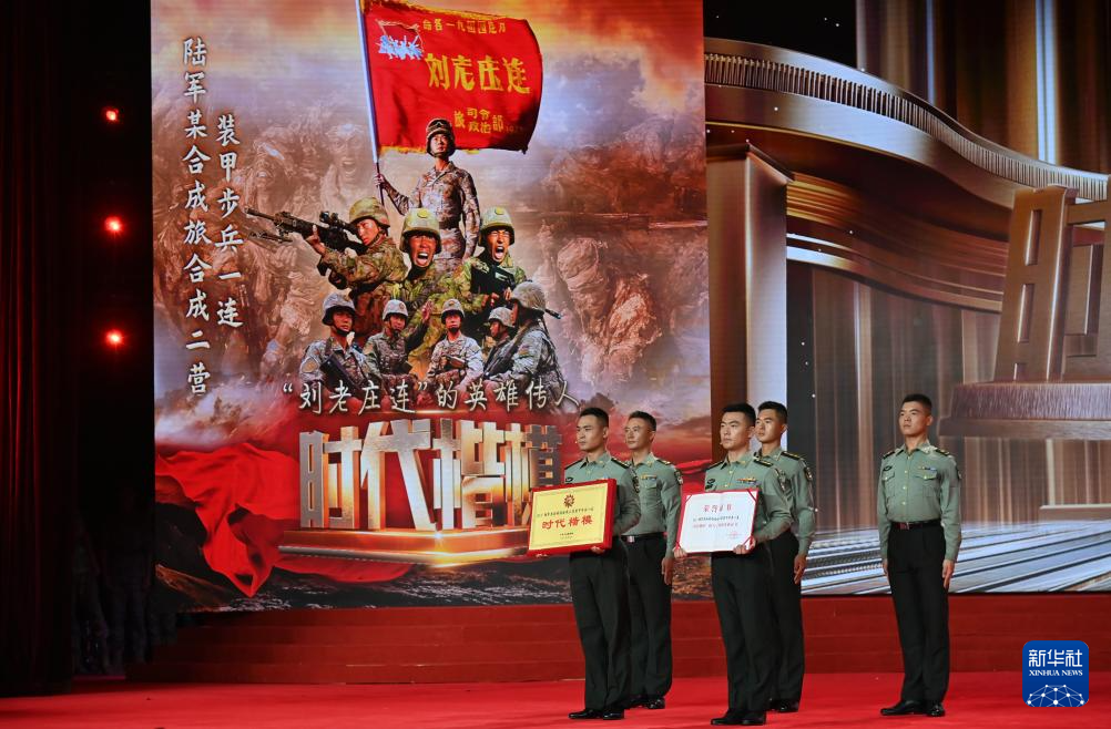 在“時(shí)代楷?!卑l(fā)布儀式上,陸軍某合成旅合成二營(yíng)裝甲步兵一連(“劉老莊連”)官兵代表領(lǐng)取“時(shí)代楷?!豹?jiǎng)牌和證書(9月29日攝)。新華社發(fā)(華夏 攝)