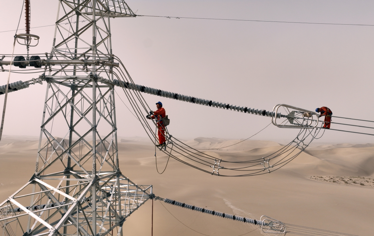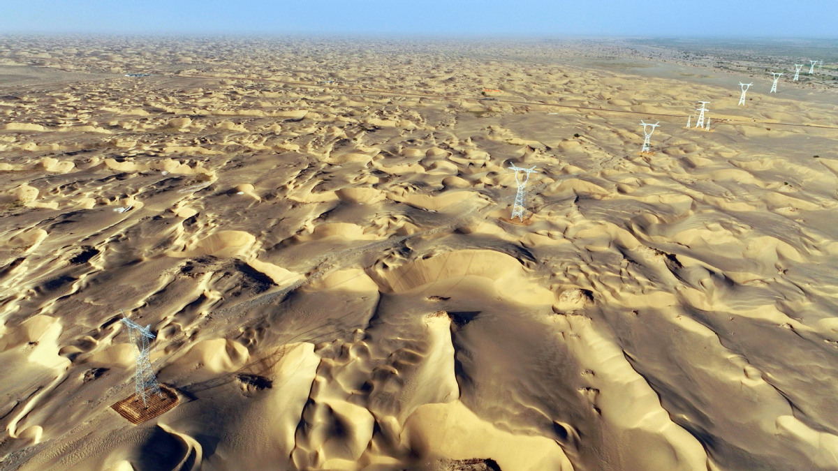 2025年6月25日,民豐—且末—若羌750千伏輸電線路工程穿越“死亡之海”塔克拉瑪干沙漠。(馬元 攝)