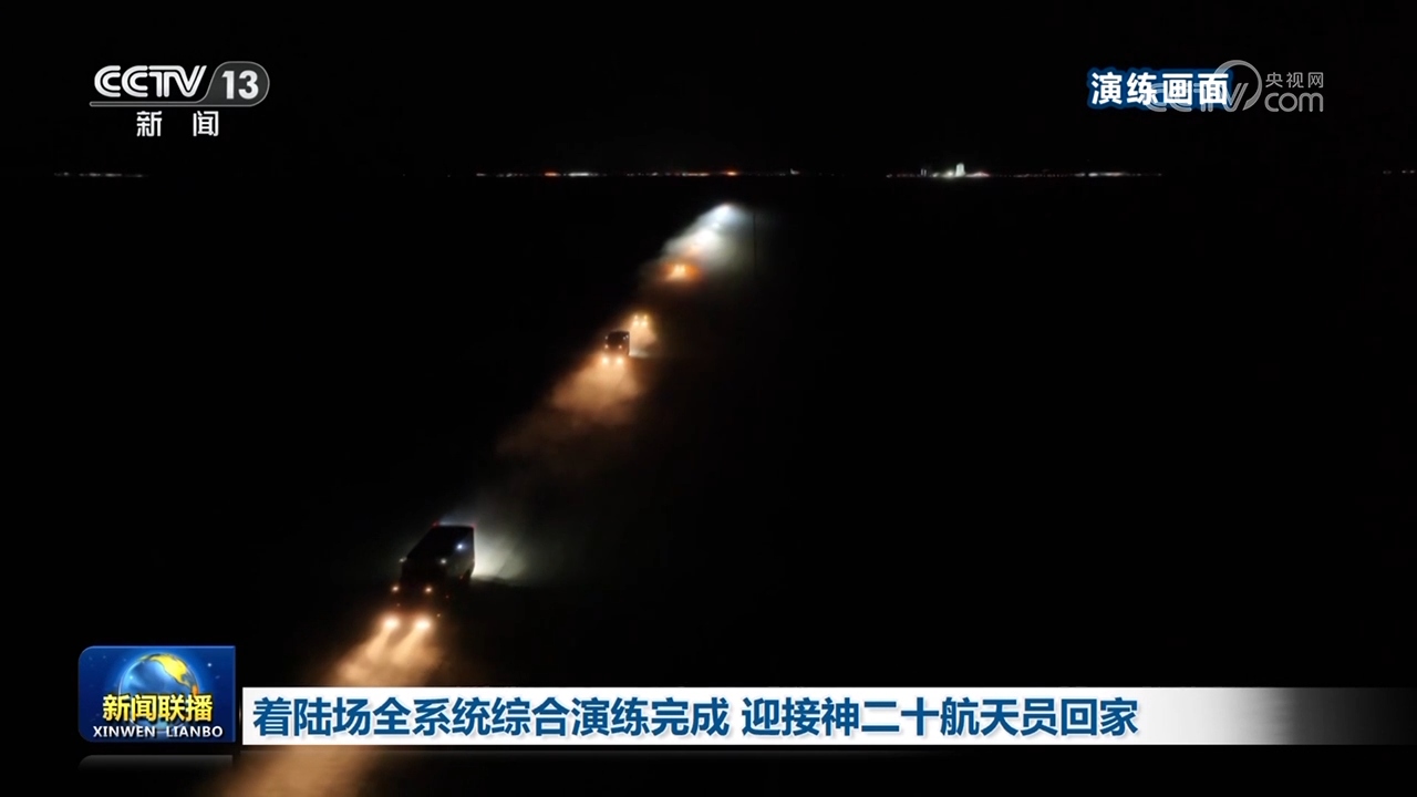 央視網(wǎng)消息(新聞聯(lián)播):神舟二十號(hào)乘組將于近日擇機(jī)返回東風(fēng)著陸場(chǎng)。11月2日晚,著陸場(chǎng)區(qū)組織所有搜救力量,進(jìn)行了最后一次全系統(tǒng)綜合演練。