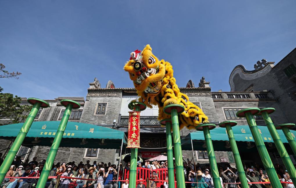 佛山黃飛鴻醒獅隊(duì)在黃飛鴻紀(jì)念館前表演。新華社記者 王鵬 攝