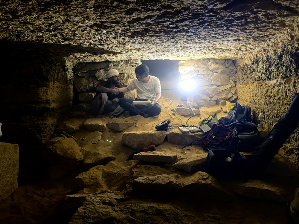 9月16日,在埃及開羅以南的薩卡拉考古遺址區(qū),中埃薩卡拉聯(lián)合考古項(xiàng)目中方領(lǐng)隊(duì)薛江(右)和埃方同行在一座貴族墓內(nèi)工作。(受訪者供圖)