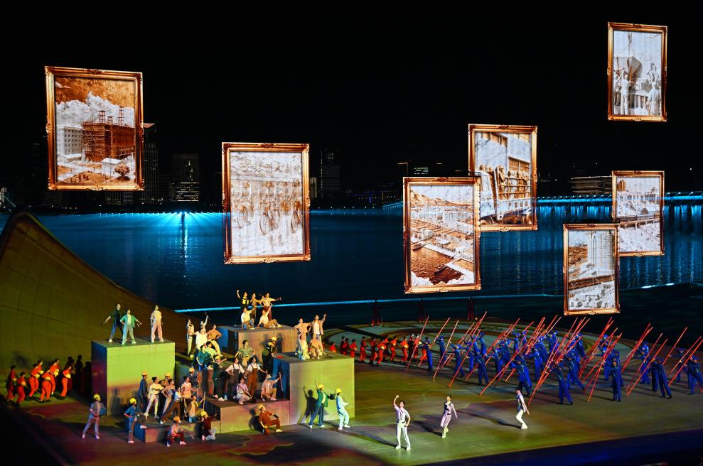 ↑11月9日,在第十五屆全國運動會開幕式上,巨型鰲魚“游入”體育場上空。新華社記者 盧漢欣 攝