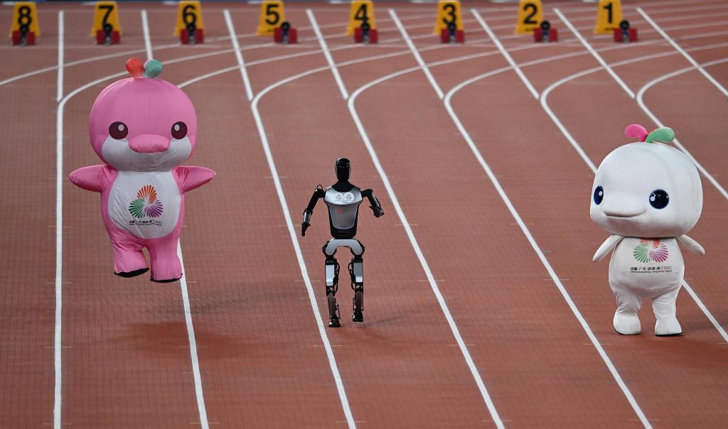 ↑11月17日,在田徑項目賽事開始前的暖場活動中,機器人和吉祥物喜洋洋、樂融融在廣東奧體中心體育場賽跑。新華社記者 周牧 攝