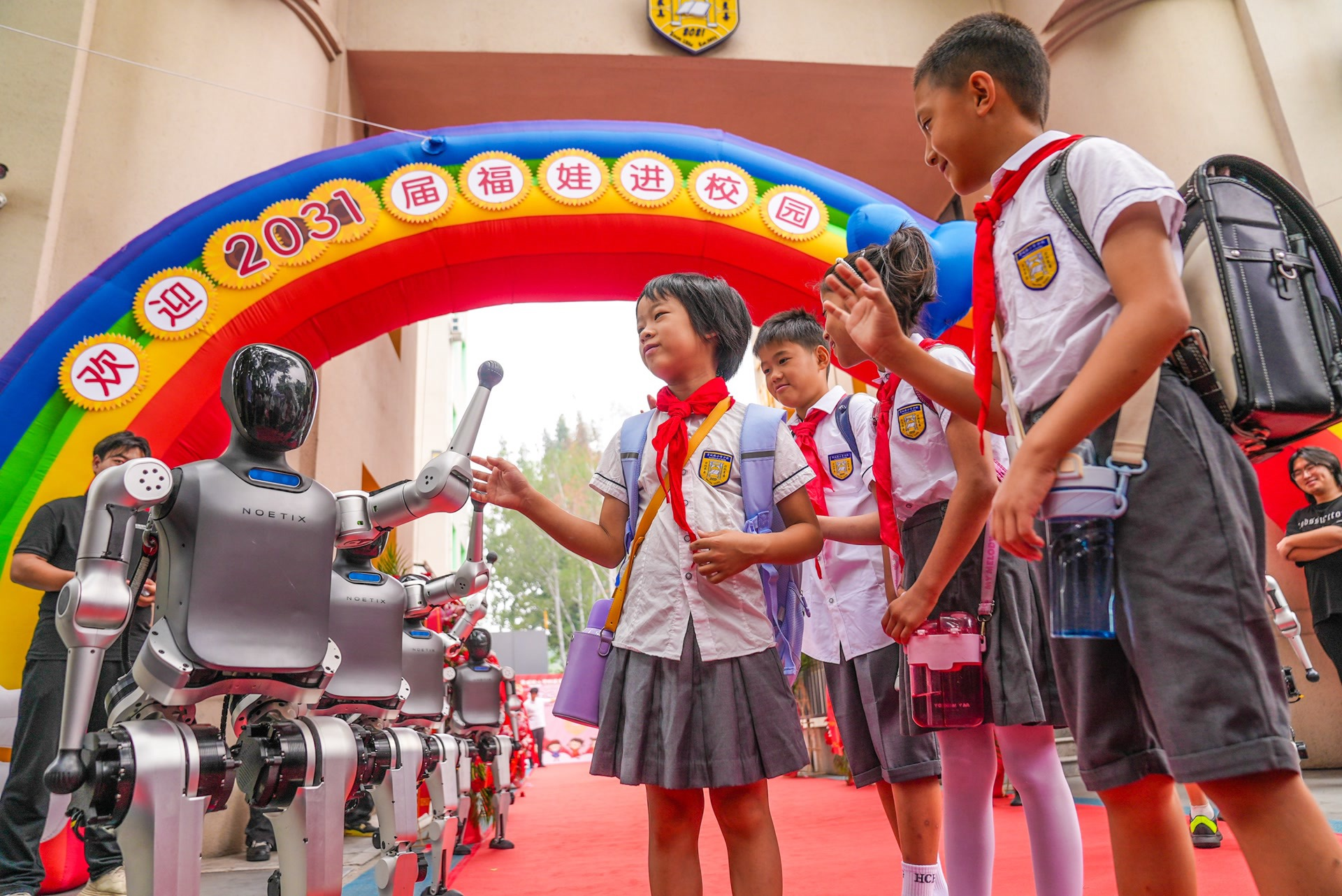 智能機器人與師生共迎新學(xué)期。
