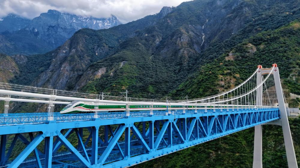11月21日,動車組列車通過虎跳峽金沙江鐵路大橋(無人機(jī)照片)。