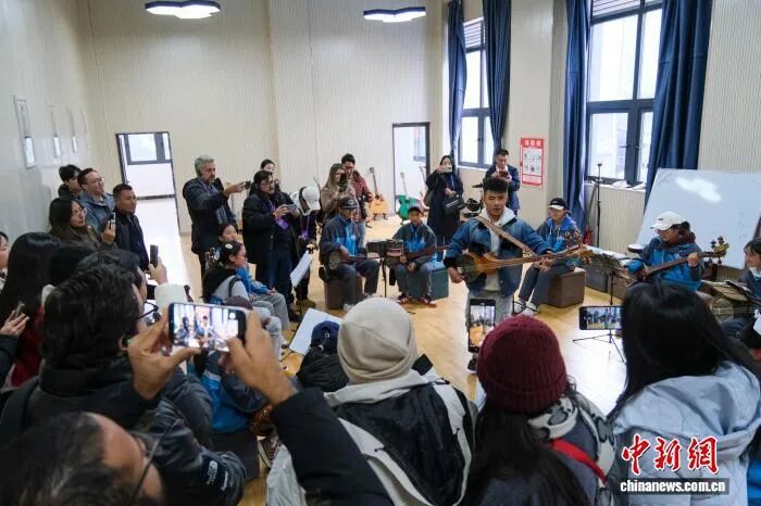 10月28日,拉美18個國家的21名記者、編輯等媒體從業(yè)者在西藏自治區(qū)林芝市巴宜區(qū)中學參訪,觀看師生們演奏藏族扎念琴。 中新社記者 江飛波 攝