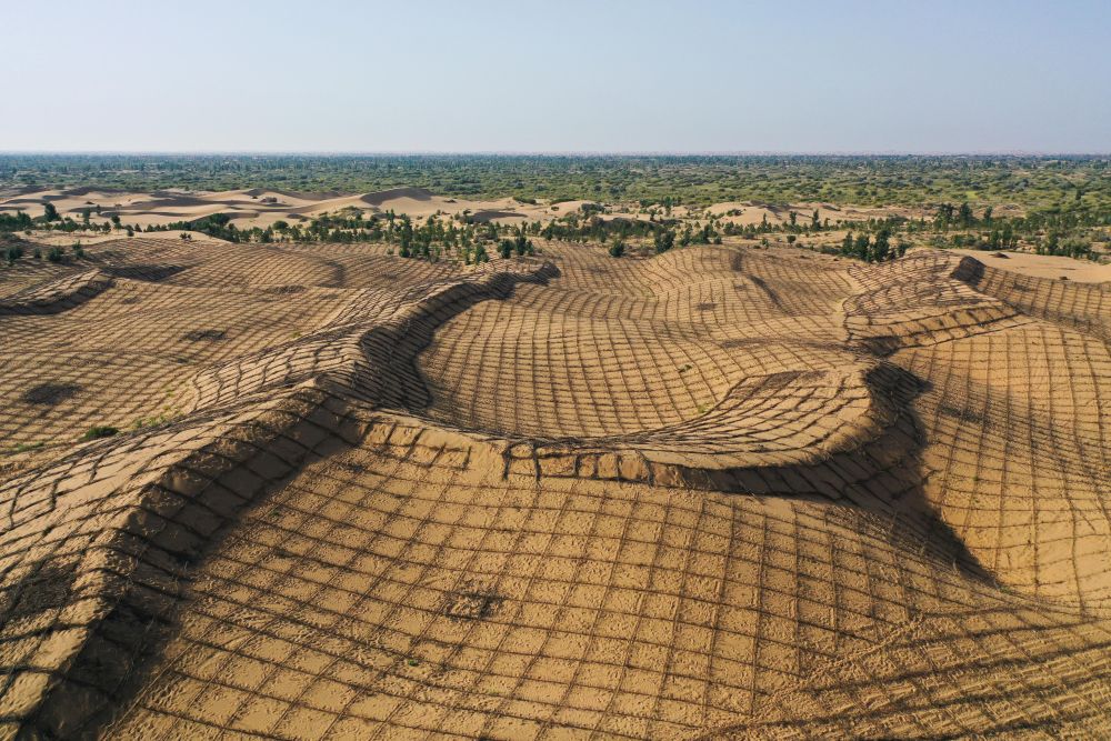 這是2025年9月12日在內蒙古鄂爾多斯市拍攝的正在治理中的庫布其沙漠(無人機照片)。新華社記者 李志鵬 攝