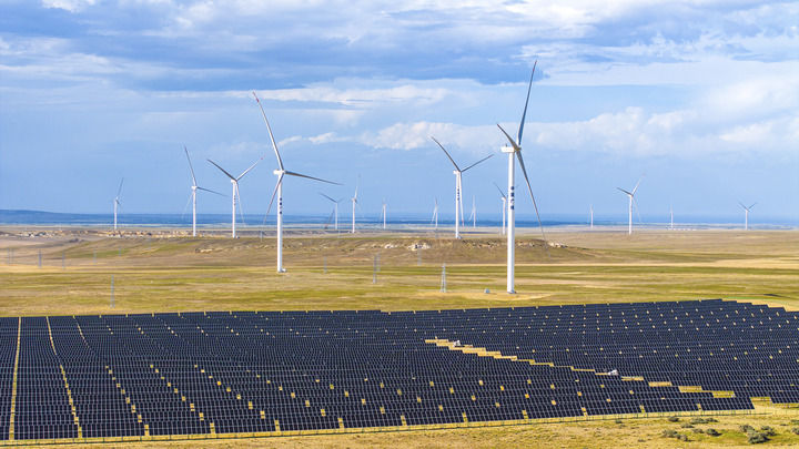 在新疆阿勒泰地區(qū)吉木乃縣拍攝的50萬千瓦時風(fēng)電項目配套輸電線路建設(shè)現(xiàn)場(2025年7月1日攝,無人機照片)。新華社發(fā)(努爾別克·努爾曼 攝)