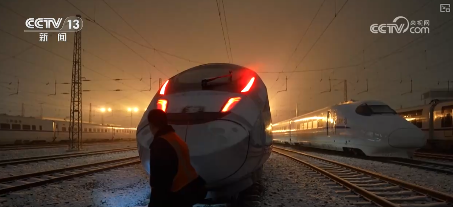 央視網(wǎng)消息:12月12日,京津冀地區(qū)迎來今冬首場大范圍降雪。為確保動車組列車在低溫環(huán)境下運行狀態(tài)良好,國鐵北京局連夜開展防寒加溫作業(yè)。工作人員在零下5℃的環(huán)境中,為動車組啟動空調(diào)系統(tǒng),提升車廂溫度,防止車內(nèi)設備、水管等因低溫凍結(jié),保障動車組列車第二天安全正點出發(fā)。