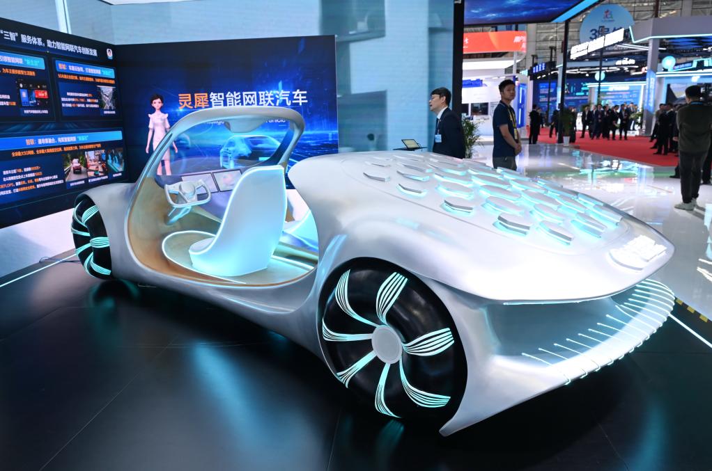 2025年4月29日,在第八屆數(shù)字中國建設(shè)峰會(huì)現(xiàn)場體驗(yàn)區(qū)拍攝的靈犀智能網(wǎng)聯(lián)汽車。新華社記者 林善傳 攝