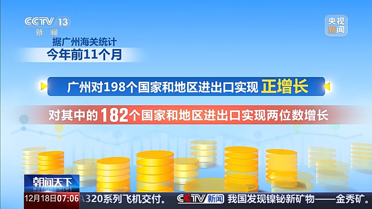 據(jù)廣州海關統(tǒng)計,今年前11個月,廣州對198個國家和地區(qū)進出口實現(xiàn)正增長,對其中的182個國家和地區(qū)進出口實現(xiàn)兩位數(shù)增長。