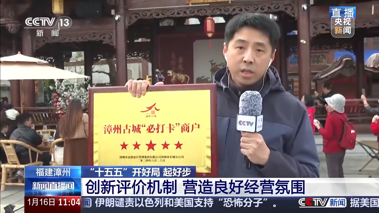 此外,我們還注意到一個(gè)細(xì)節(jié)。這里有一些商家,獲得了這樣一種帶有星級(jí)評(píng)價(jià)的獎(jiǎng)牌。這是漳州古城聯(lián)合了當(dāng)?shù)匚穆?、商?wù)、市場(chǎng)監(jiān)管等部門共同授予。目前,當(dāng)?shù)叵嚓P(guān)部門每?jī)赡甓紩?huì)對(duì)古城內(nèi)的商戶開展文明誠(chéng)信經(jīng)營(yíng)示范評(píng)選,經(jīng)過線上投票、現(xiàn)場(chǎng)考察、線下評(píng)分等環(huán)節(jié),上榜單位將得到漳州當(dāng)?shù)赜杏绊懥Φ墓娞?hào)、視頻號(hào)等的推廣支持,不僅讓精品商鋪能夠出圈,提升古城的游客流量,也激勵(lì)其他商戶,來共同營(yíng)造良好的經(jīng)營(yíng)氛圍。