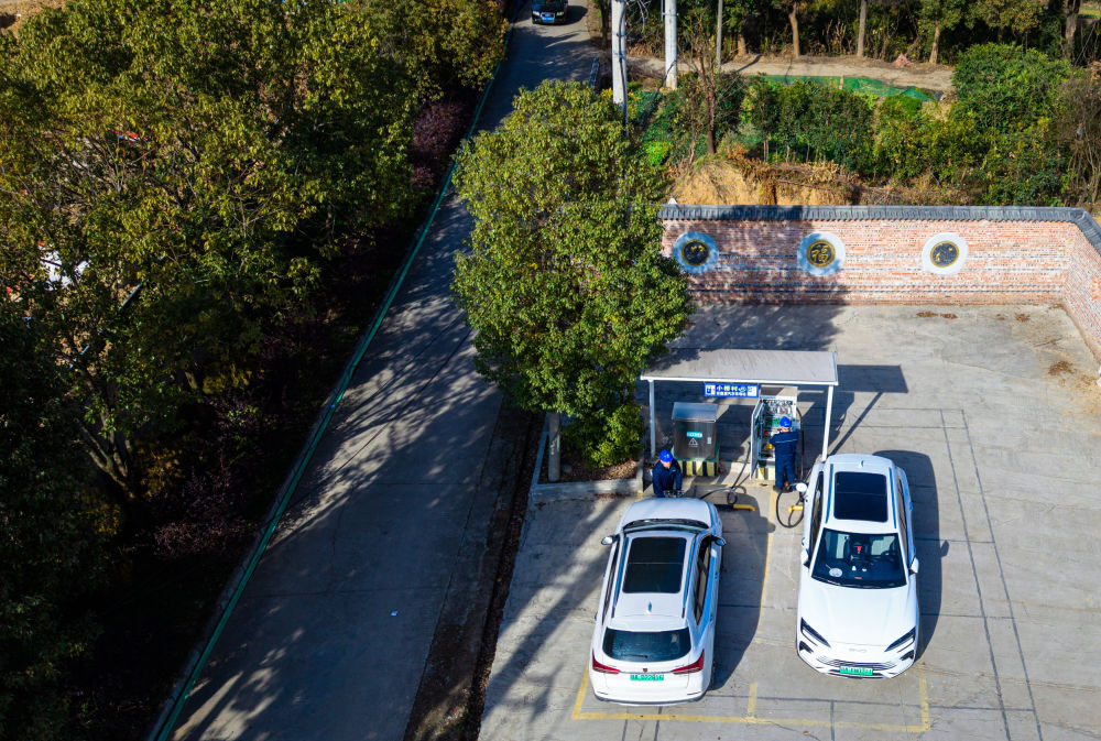 2026年1月11日,國網(wǎng)鄂州供電公司工作人員對(duì)鄂州市鄂城區(qū)西山街道小橋村充電站的充電設(shè)備進(jìn)行巡檢(無人機(jī)照片)。新華社記者 肖藝九 攝