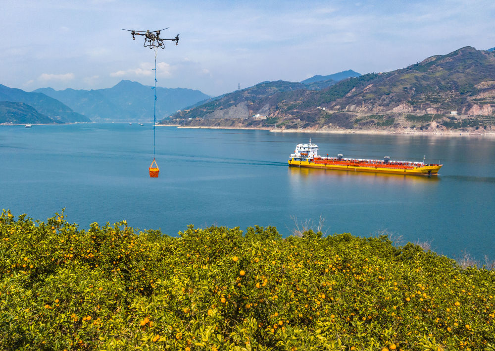 2025年3月17日,湖北省秭歸縣郭家壩鎮(zhèn)鄧家坡村村民用無人機(jī)轉(zhuǎn)運(yùn)臍橙(無人機(jī)照片)。新華社發(fā)(鄭家裕攝)