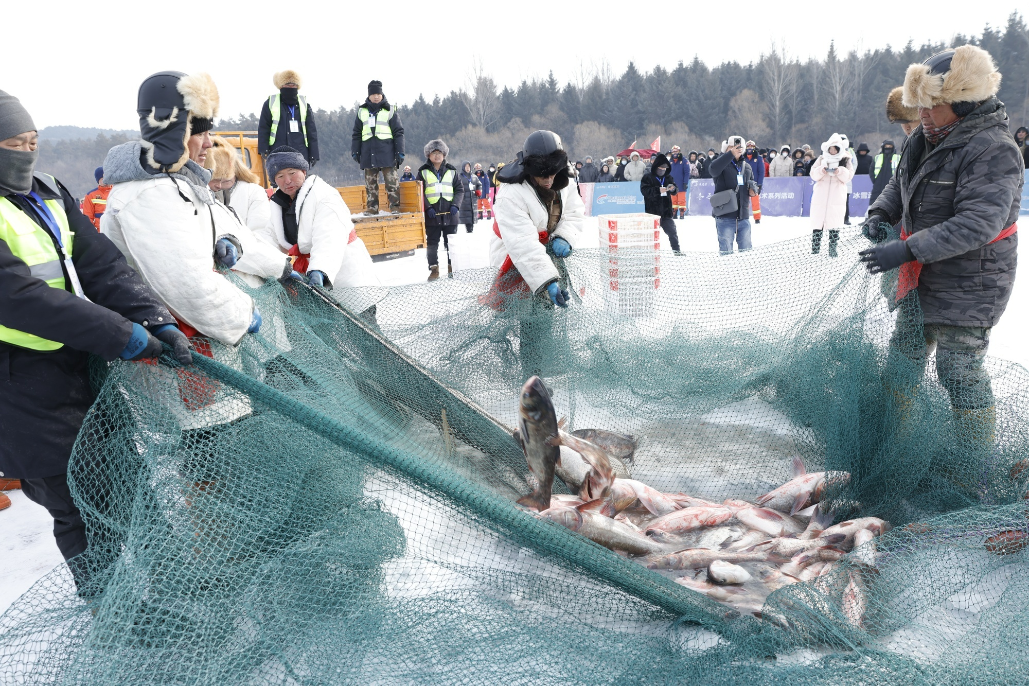伴隨著“魚把頭”一聲令下,數(shù)萬條活魚躍出水面,“冰湖騰魚”的盛景瞬間點燃寒冬。