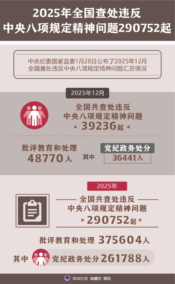 中央紀委國家監(jiān)委28日公布了2025年12月全國查處違反中央八項規(guī)定精神問題匯總情況。當月,全國共查處違反中央八項規(guī)定精神問題39236起,批評教育和處理48770人,其中黨紀政務處分36441人。2025年,全國共查處違反中央八項規(guī)定精神問題290752起,批評教育和處理375604人,其中黨紀政務處分261788人。