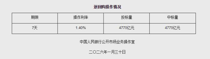 據(jù)央行網(wǎng)站消息,2026年1月30日中國(guó)人民銀行以固定利率、數(shù)量招標(biāo)方式開展了4775億元7天期逆回購(gòu)操作。具體情況如下: