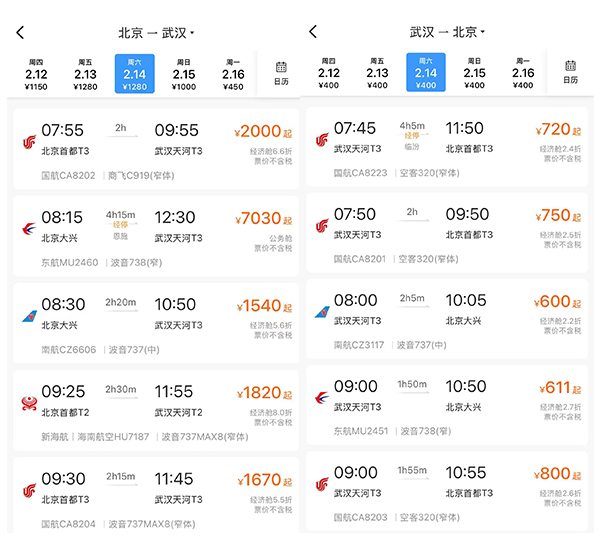 以1月30日價(jià)格為例,鐵路12306平臺(tái)顯示2月14日從北京到武漢的經(jīng)濟(jì)艙票價(jià)千元不等,而“反向出行”票價(jià)優(yōu)勢(shì)顯著。(圖片截取自鐵路12306客戶(hù)端)