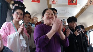 車廂里,國家級非遺沾化漁鼓戲現(xiàn)場開唱。旅客們都圍攏過來,在回家的路上聽了一段地道年戲。